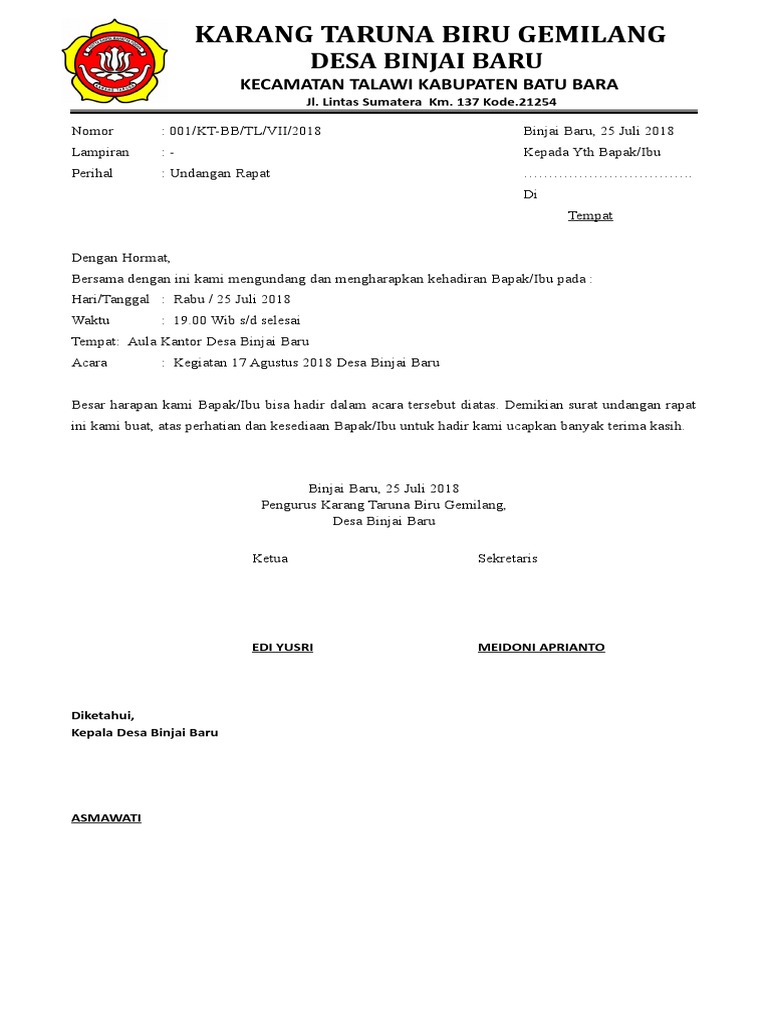 Contoh surat resmi undangan rapat desa rt/rw dan kelurahan. Surat undangan sendiri terdiri dari surat undangan resmi dan surat undangan tidak resmi. Isi surat adalah bagian yang paling penting karena mengambarkan isi dari surat yang berguna mengajak penerima untuk menghadiri acara atau kepentingan resmi tertentu. Surat undangan sampai kini memang kebanyakan kita tau masih berbentuk fisik meskipun era teknologi dalam hal tersebut tentu mencakup posting yang admin tulis dan bagikan hari ini yaitu contoh surat undangan rapat desa yang mana ini tentu akan sangat berguna wb. Surat undangan sendiri memiliki dua jenis, yakni surat undangan resmi dan tidak resmi. Hormat kami, kepala desa sunggingan. Melalui surat.ini kami menyampaikan undangan kepada seluruh ketua, sekretaris dan bendahara gb toba serta ketua, sekretaris dan bendahara gb toba untuk hadir dalam rapat kerja. Jadi dapat disimpulkan bahwa surat undangan adalah surat yang digunakan individu atau instansi untuk mengundang orang atau pihak lain untuk. Memiliki kepala surat atau kop surat di awal surat. 13 contoh surat undangan resmi dari desa untuk ketua rt. Namun, banyak orang yang belum memahami cara membuat undangan rapat yang baik dan benar. 10th maret 2021 4 min read. Namun pada pembahasan kali ini, kami tampilkan 5 contoh surat undangan yang sering digunakan dalam khalayak umum dari sekolah sampai perusahaan, desa, dan mahasiswa.